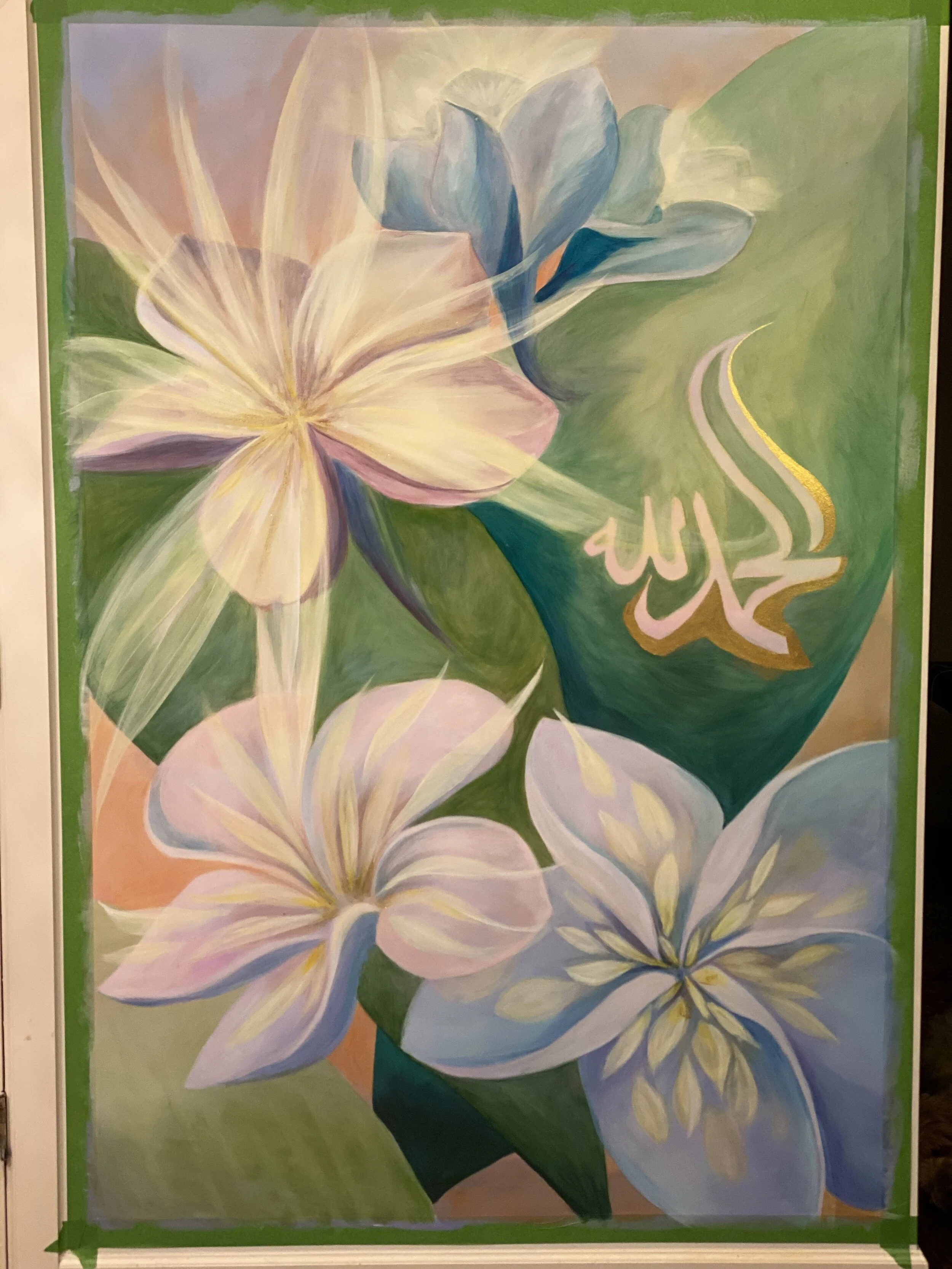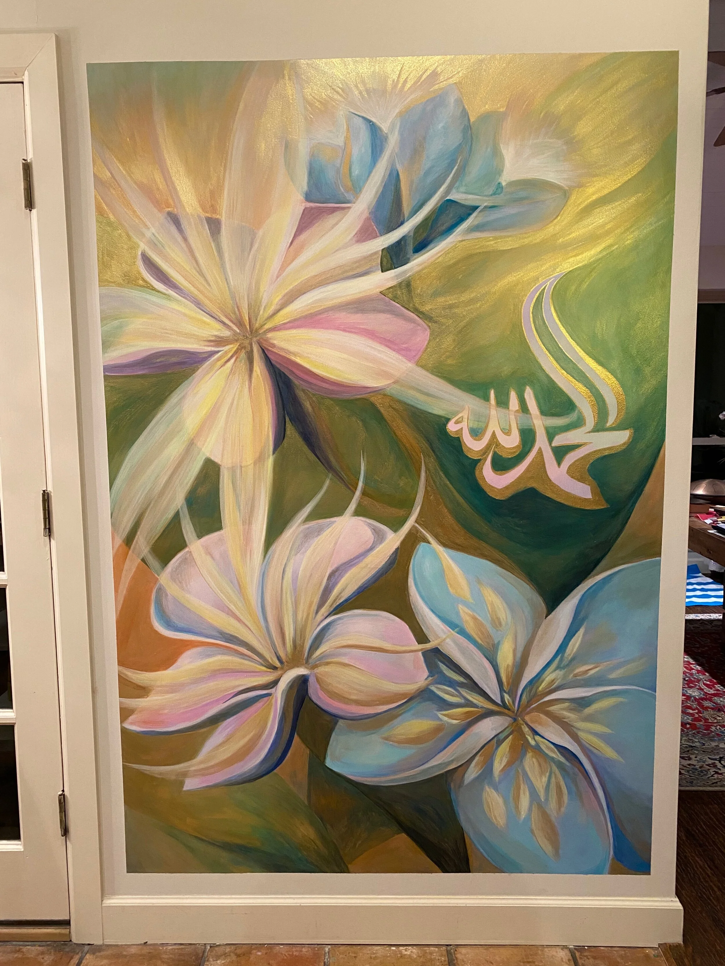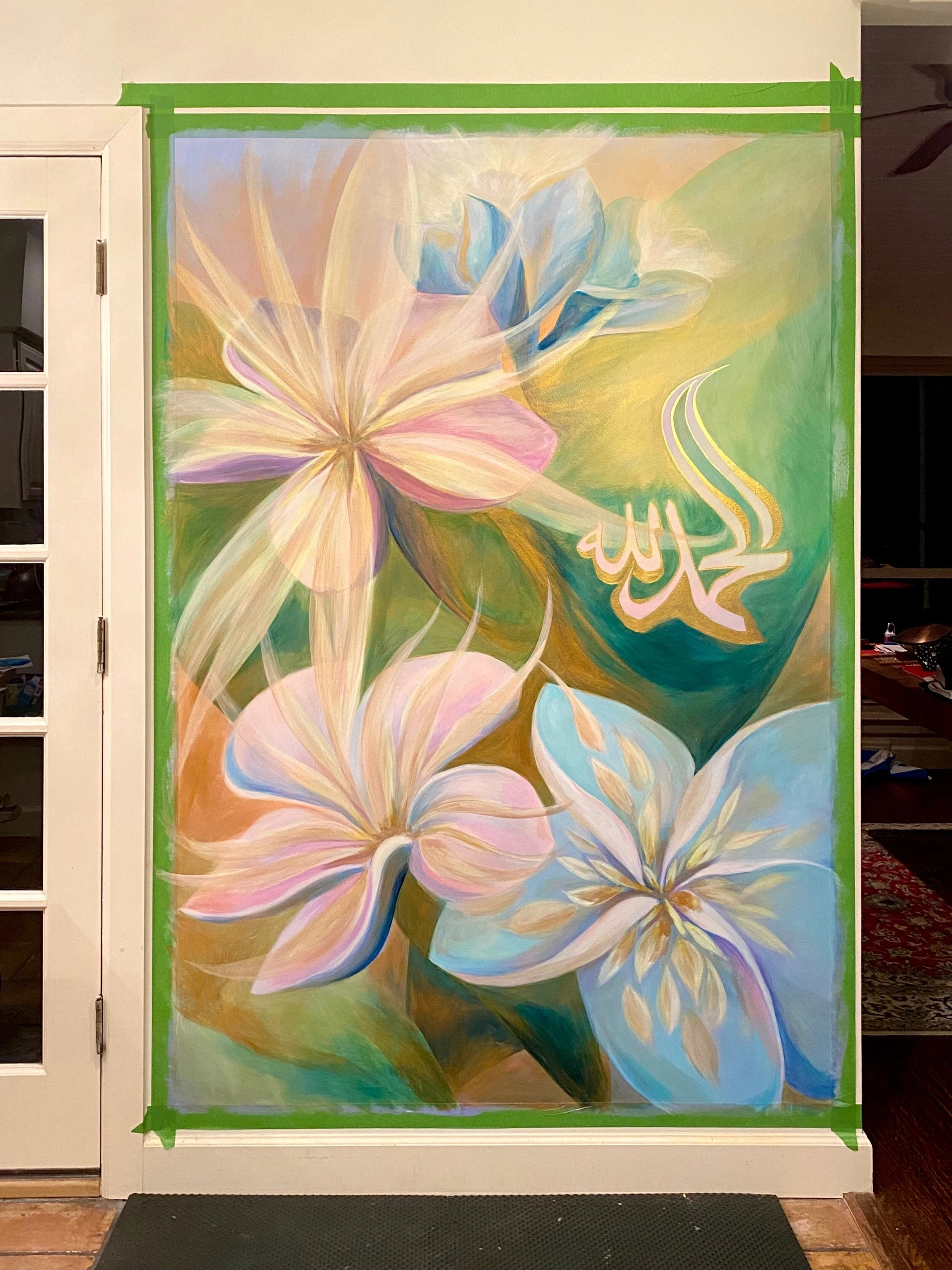 The images below show the progression of a mural in the kitchen/ gathering area of a home. The main image is the frangipani flower with text in Arabic which reads Alhamdulillah, meaning, Praise God for all things.