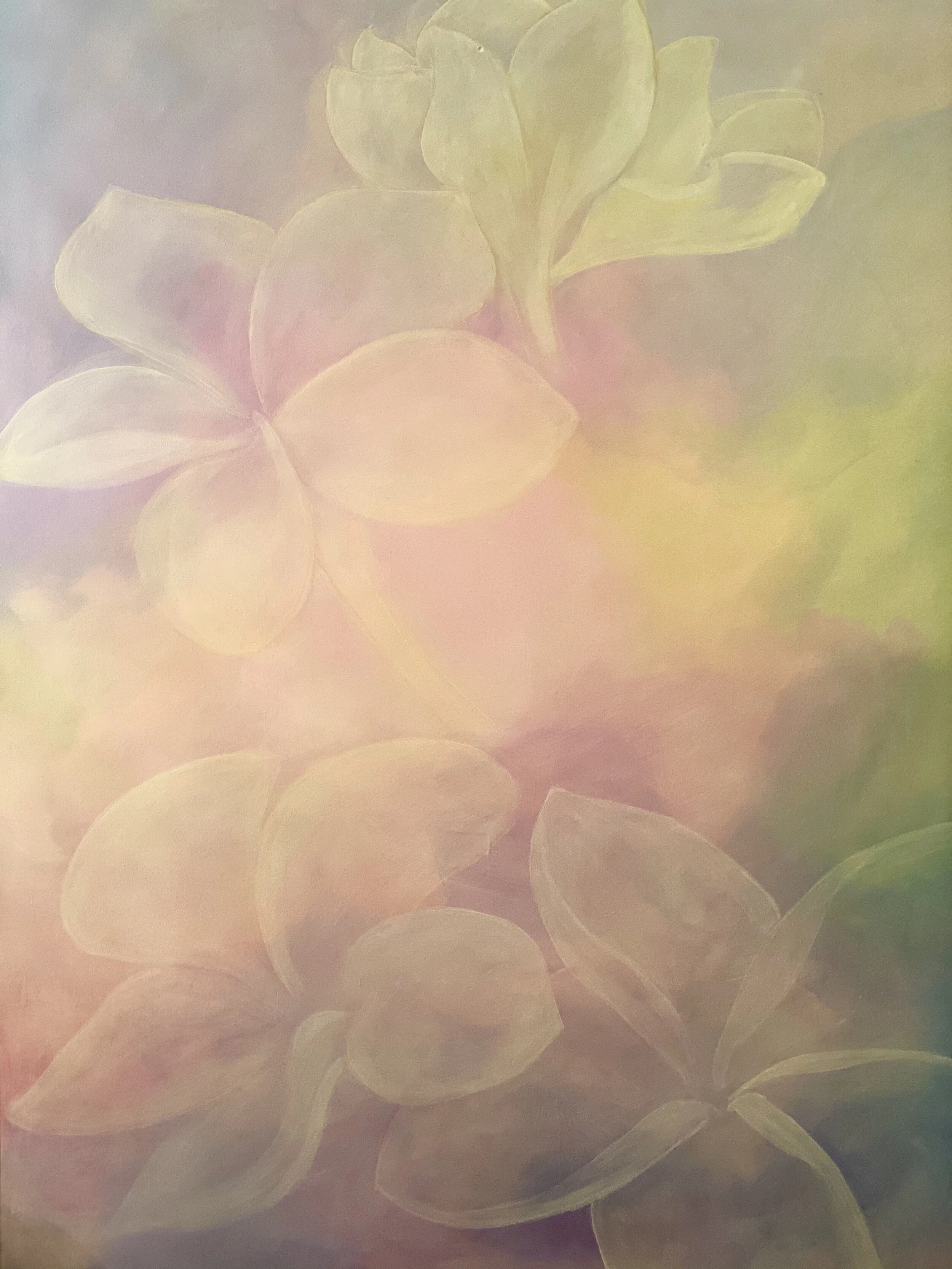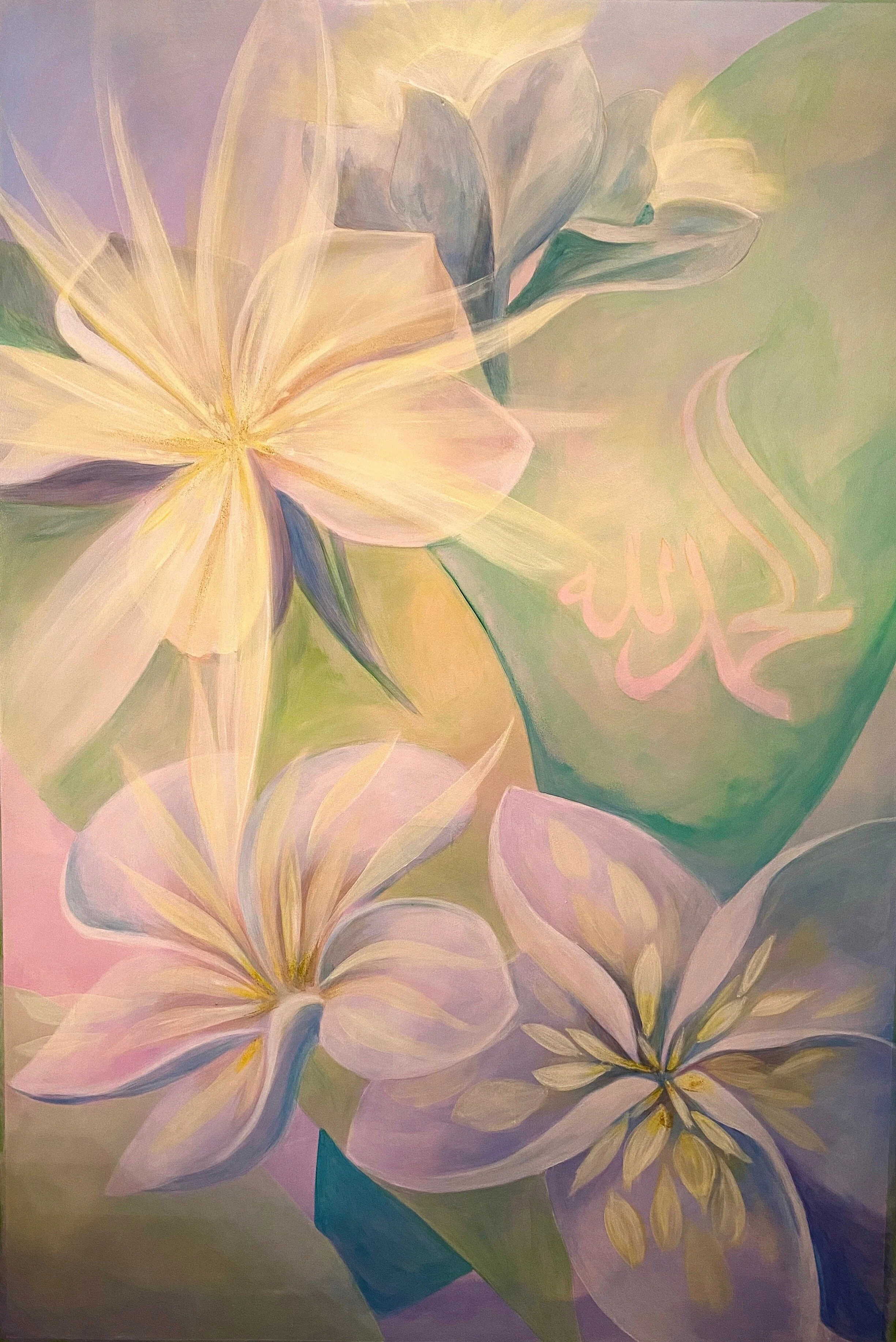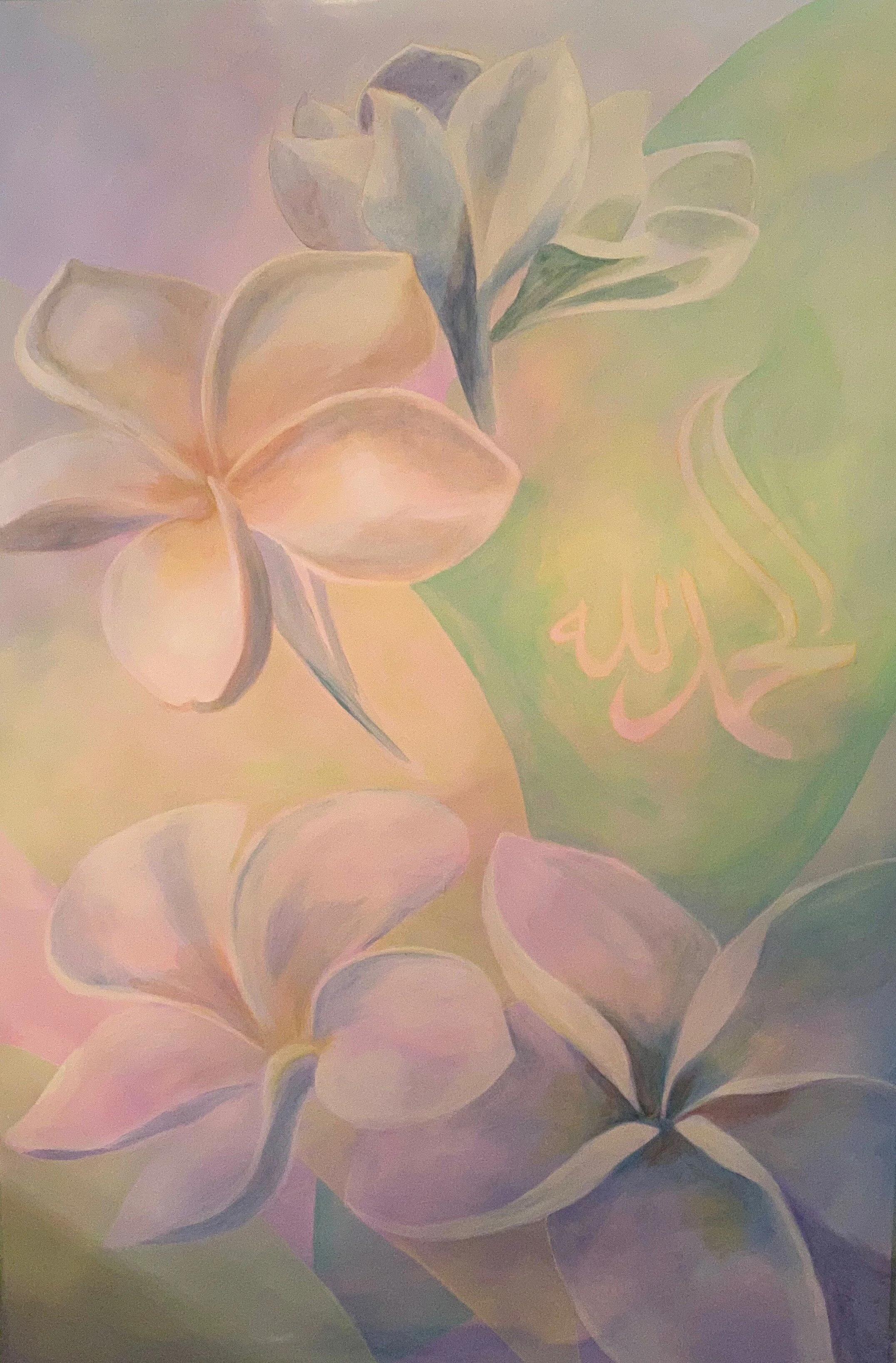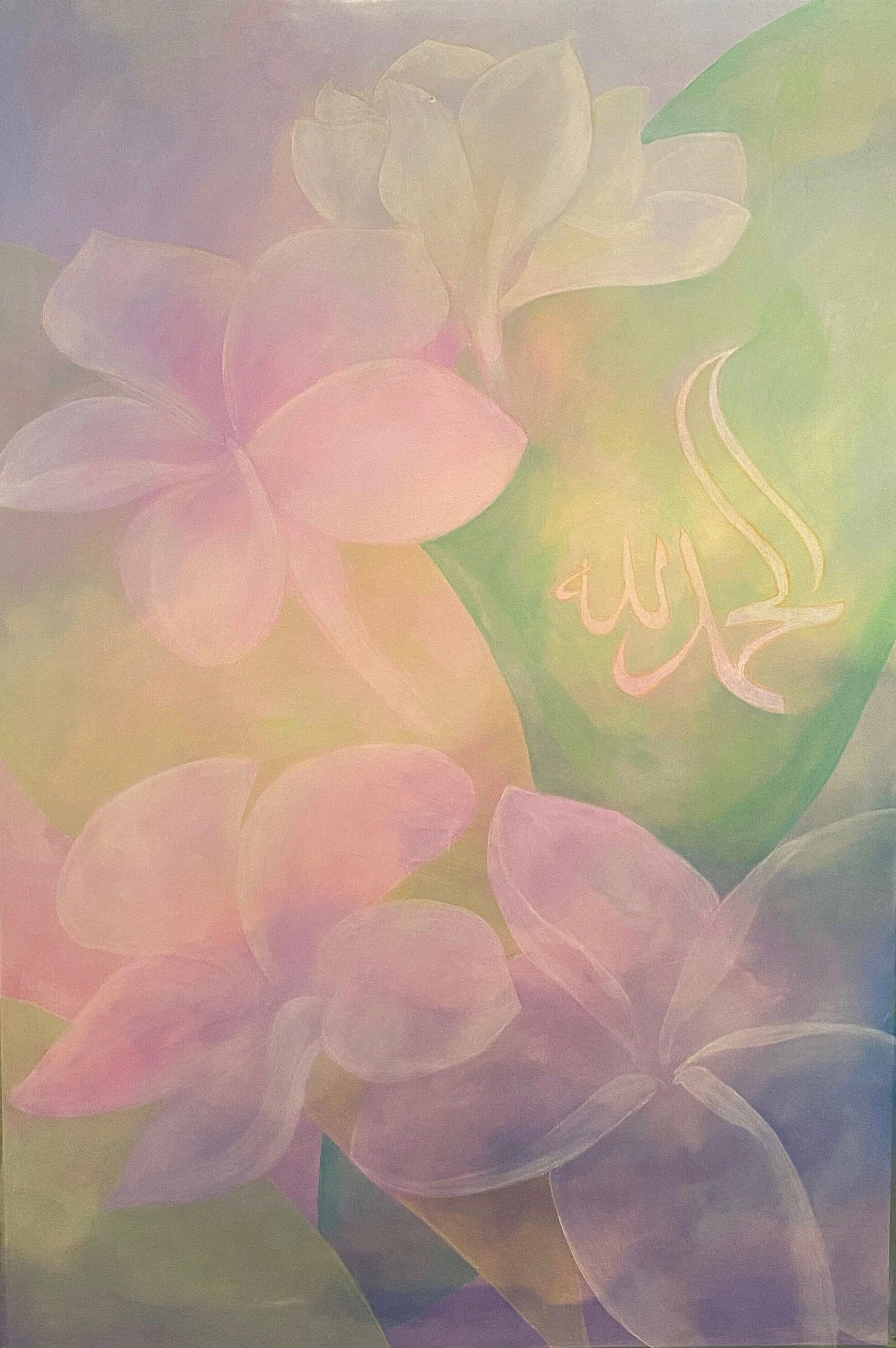 The images below show the progression of a mural in the kitchen/ gathering area of a home. The main image is the frangipani flower with text in Arabic which reads Alhamdulillah, meaning, Praise God for all things.